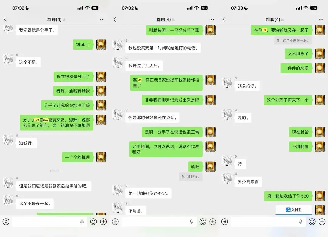 男方买新车,我最起码给他加了8~10箱油。我不给他,他就找我要;我问他,他就说没钱。