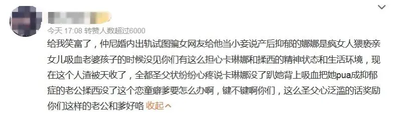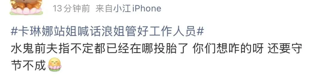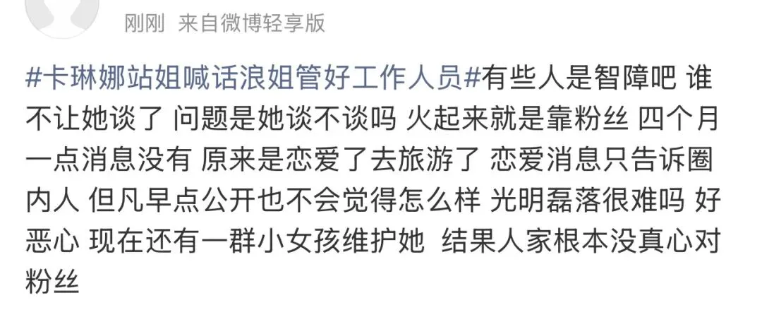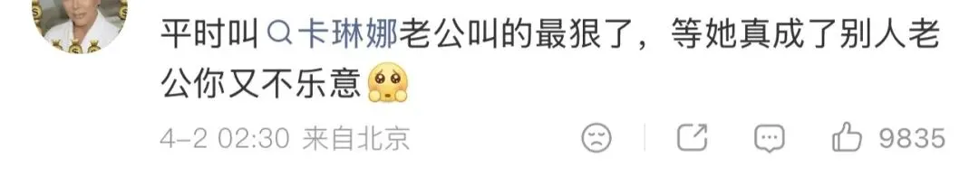 更有甚者直接开怼那些指责的粉丝:“不谈也不会跟你谈啊,瞎操什么心”、“哪儿来的控制欲?人家不是人,不能谈恋爱?”、“粉圈果然都癫了,卡琳娜连孩子都有了,却没了谈恋爱的自由”……