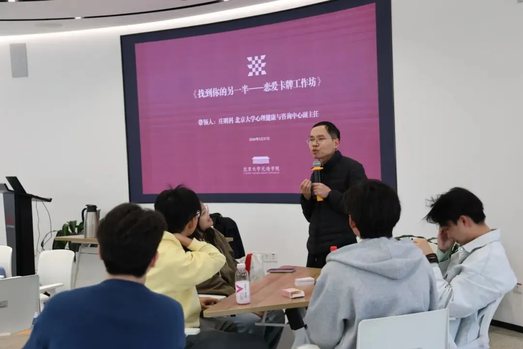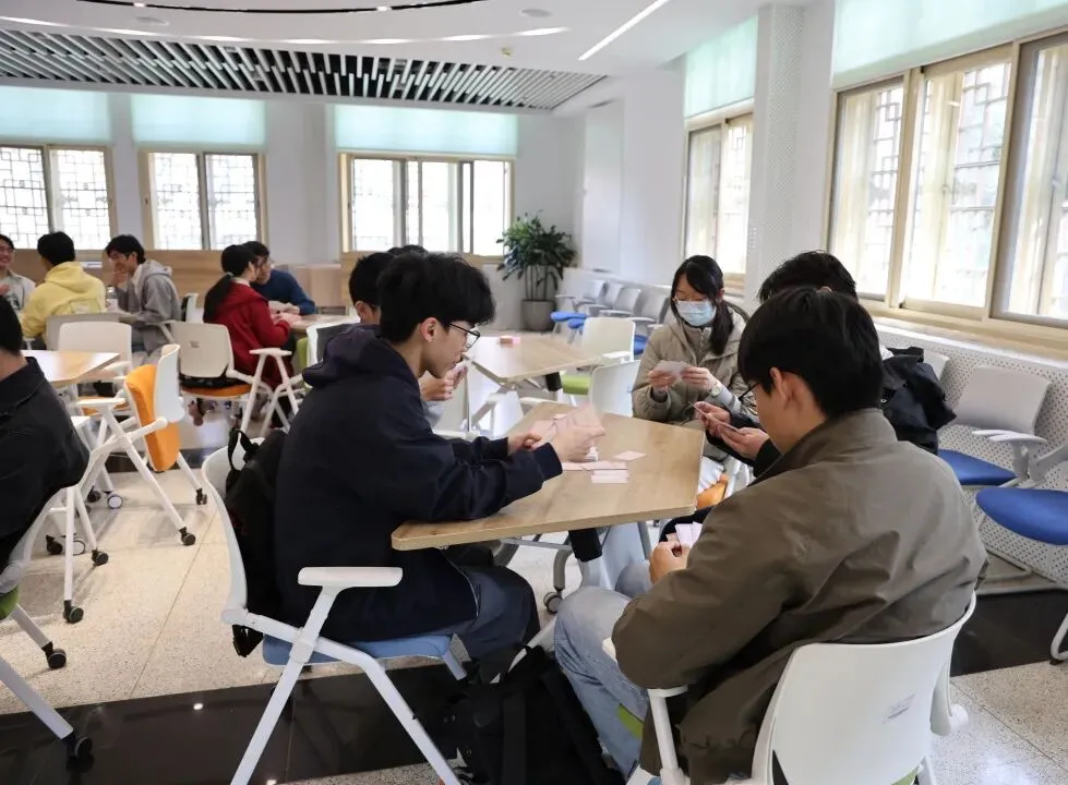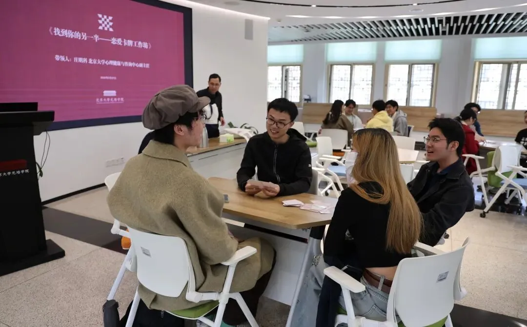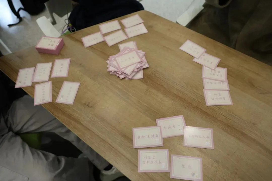 在一次次的讲述与卡牌的抉择中,每位同学都既在想象中勾勒自己的随机恋人的模样,思考和大胆表达自己对恋人各种性格的看法,又倾听其他人的想法和观点。庄老师也在各组间悉心引领,协调进度,倾听各个同学的想法,给出专业的指导。在这样的交流和庄老师的串场下,同学们逐渐褪去拘谨,坦诚表达,各抒己见,慢慢找到自己的恋爱观,并体会与他人恋爱观的差异和相似。