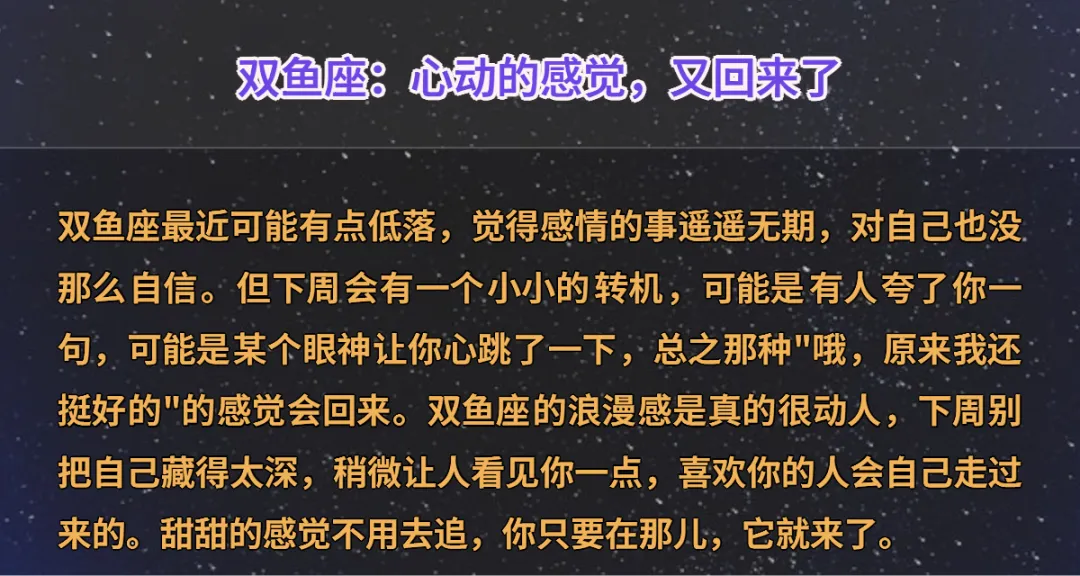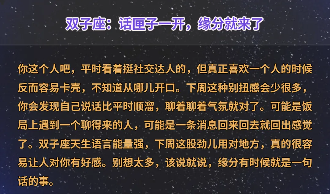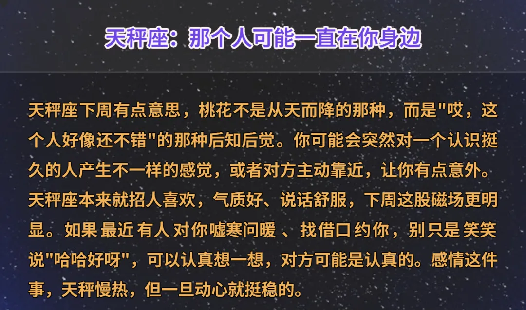 有时候缘分这个东西,真的很奇怪。你越是主动去找,越是找不着;偏偏你放松下来、专心过自己的日子,它就悄悄摸到你门口了。下周的星象有点意思,金星的能量走得比较活跃,几个星座的感情频道像是突然被调开了静音,桃花运正在路上,说不定就是你。