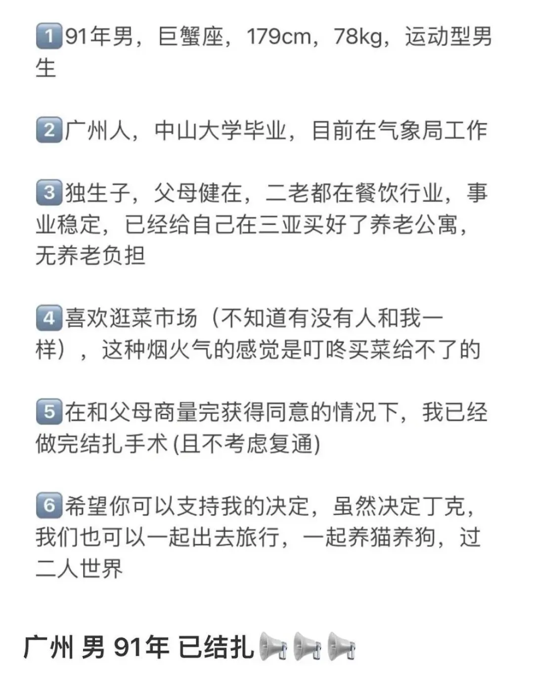 有位90后男生发相亲帖:中山大学毕业,气象局工作,179cm,重点是已结扎。
