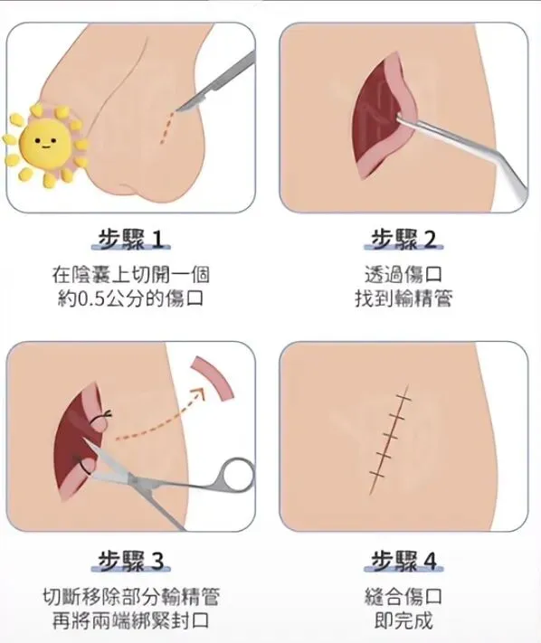原理很简单——在阴囊一侧做一个小切口,找到输精管将其提起,切断一小段输精管,再将两端绑紧封口,最后缝合伤口。