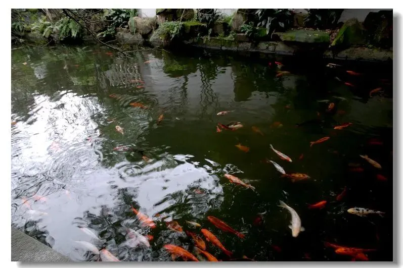 满池金鲤,活蹦乱跳想起以前喂鱼的情景可惜手中没有食品,呆呆看了许久......