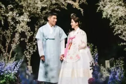 照片中,韩彩雅身穿洁白的婚纱露出灿烂的笑容,丈夫车世智身穿燕尾服也十分的精神奕奕。另一照片中,两人身穿韩服相互对视,十分深情开心地笑着。