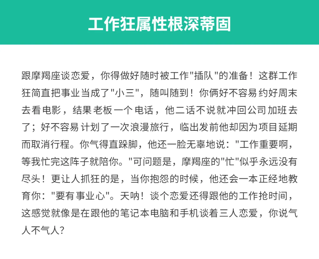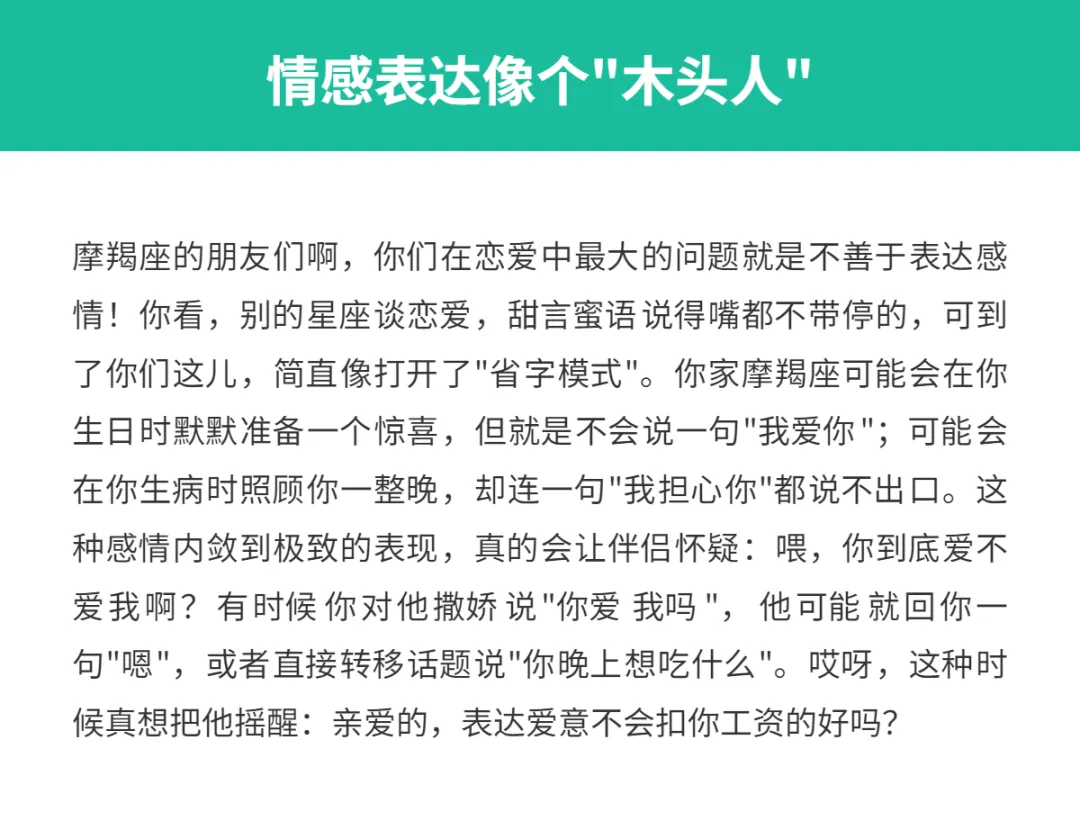 亲爱的星座朋友们,咱们今天要聊的是摩羯座在恋爱中那些让人又爱又恨的特质!作为十二星座中最务实的一员,摩羯座的恋爱方式可真是独树一帜啊!你有没有遇到过这样的摩羯座恋人?明明很爱你,却总是一副冷冰冰的样子,让你摸不着头脑?或者明明你俩已经在一起很久了,他还是像刚认识时一样拘谨?没错,这就是典型的摩羯座!他们的感情世界就像一座冰山,表面上看起来冷酷无情,但水面下却藏着炽热的心。今天就让我来揭秘一下,摩羯座在恋爱中最让人抓狂的那些小毛病吧!
