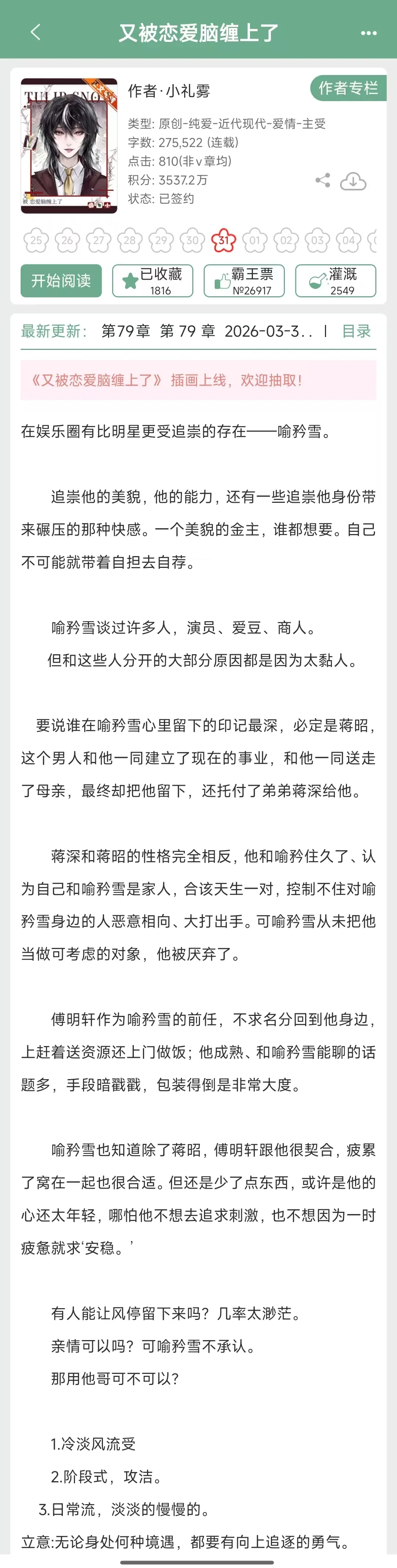 淡淡的日常流,没什么剧情,吸引我看下去的点是受流露出的性感又冷淡的主人气质以及各种攻酸涩,总之完全就是情感上的主导者和上位者。全文也不长,可以当一篇不带脑子看的文。文笔的话就是正常,综上所述给到三星半推荐。