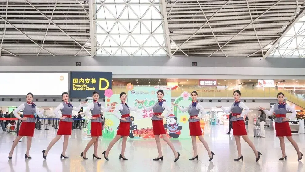成都航空的乘务员们率先以一段富有青春律动的舞蹈点燃现场气氛。