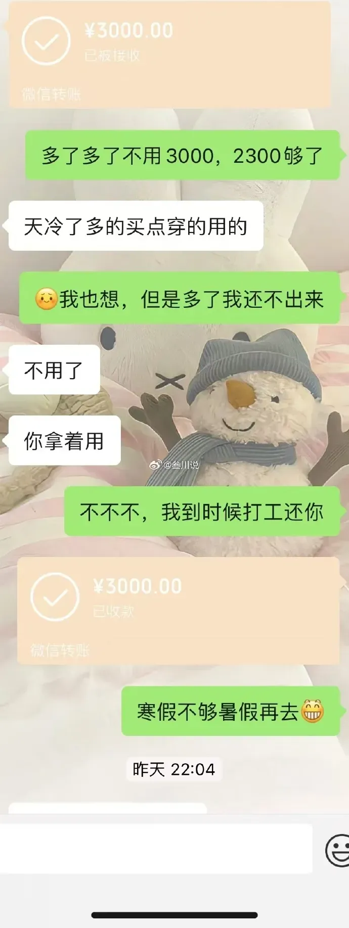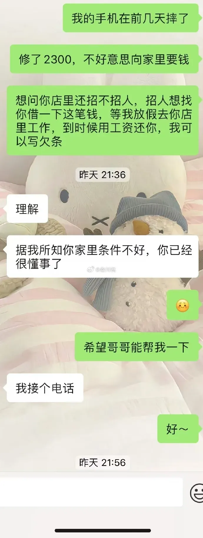 拿去修,老板一检查,屏、面容、内部基本全废,修要2300。这2300我拿不出来,也完全不敢跟家里说。然后我去找暑假打工的那个老板借钱,本来就想着借2300,等寒假再去打工慢慢还,没想到他连犹豫都没有,直接转了3000,说不用还。