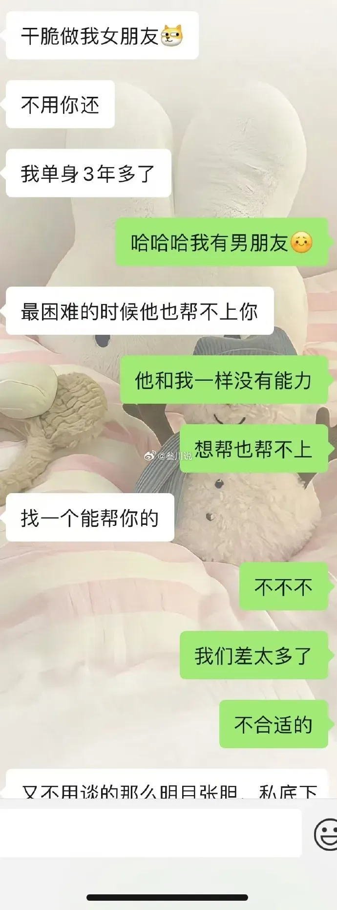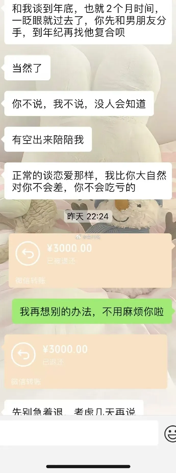 他说,让我做他女朋友,做到年底,他是知道我有男朋友的,让我和我男朋友先分开两个月,等我和他这段结束,再回去找原来的对象,还说我和他在一起期间,每个月再给我1000零花钱。
