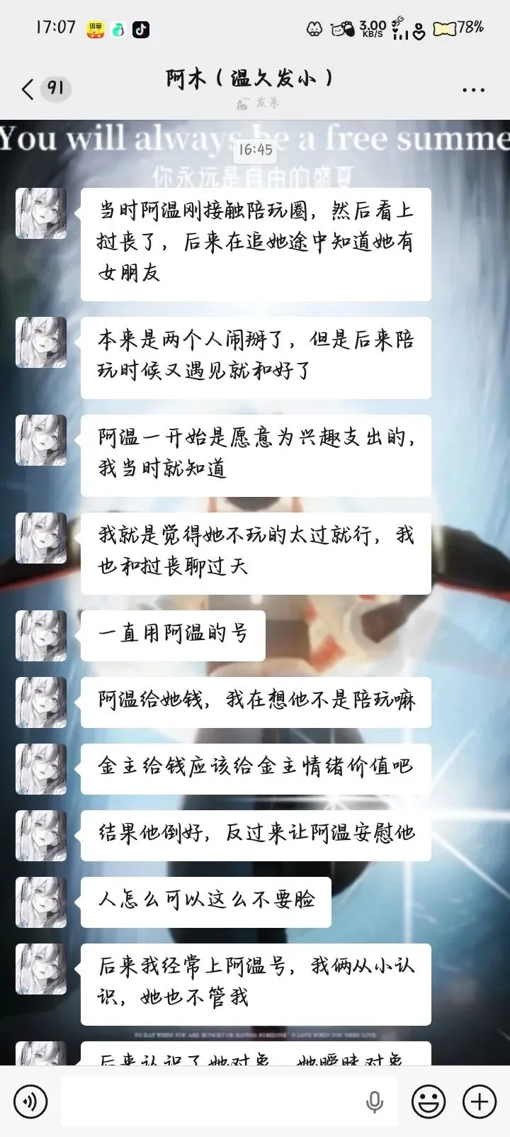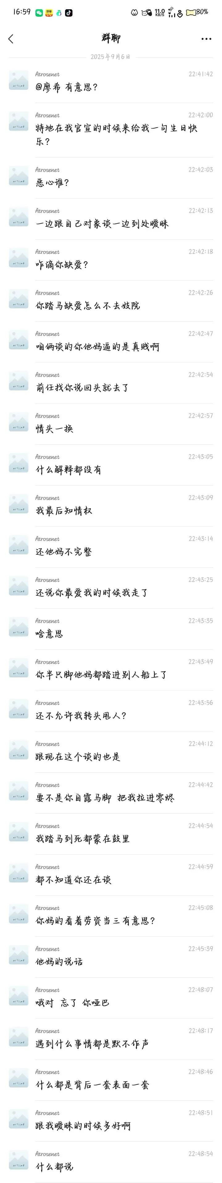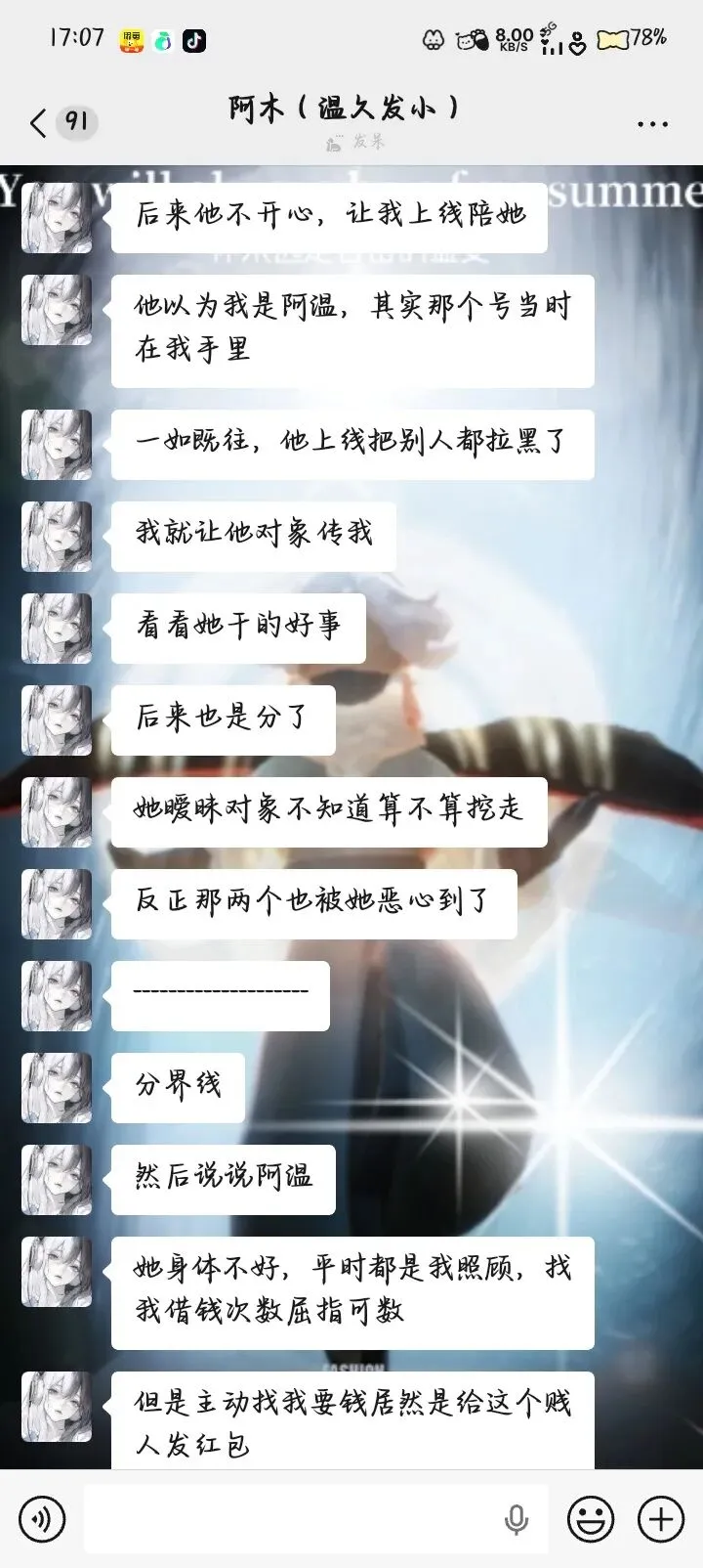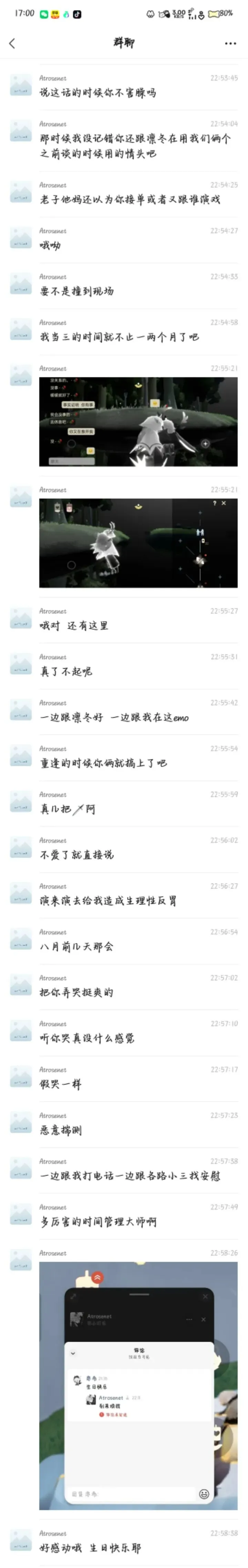 苦主②:温久(暧昧被圈钱500+)苦主③:白陵(被偷单内截图)苦主④:阿木(温久好友)苦主⑤:夏茉团长(被瓜主牵扯)瓜1:行云在25年2月-3月期间(具体时间记不清)同前任分手,以及后续事情处理结束打击有点大,清池在这时向行云表白,并说“我是喜欢你146天的狗”,在磁场低的时候遇到说这话的人相信大家大多数都会误判,失去判断力,从而在一起,行云也是这样,和清池在一起后,刚开始还行,到后面清池就开始暴露本性,在快手hw直播,与前任纠缠不清,与初恋换情头,深夜拉黑行云陪暧昧对象挂机睡觉,如果不是行云可以换号查岗,怕是一直被蒙在鼓里。详细说与初恋换情头事件:行云有次找清池的时候,发现有个和行云常驻很像的小黑,行云就登了清池给的光遇号重新找清池,点火之后就是拉黑删除的“好友”,备注是🥀,这很不巧,行云的团分小组,清池所在的组就是🥀组,这还说啥了,行云就是清池找来的初恋替身,最后行云和清池分手了之后,因为脱敏没有脱彻底以及想报复清池,所以在25年5月的时候选择回到清池身边,暧昧了一阵之后清池换上了情头,行云在这时只觉得是情头单或者陪哪个前任换的,却万万没想到,行云在这一刻起,变成了小三。行云在这时候还没有意识到清池谈了对象,一直到6月底左右上光遇找清池,撞破了清池和现任“调情”时刻,就选择和清池划清界限,但是行云暗示清池“我想你了”,清池就开始主动给行云发信息,主动暧昧,还给行云送了个粽子头饰礼包,后面更是给行云买了一束花和一个奔跑熊作为礼物,当然钱从何而来我们就不知道了,后来清池把行云拉到了她所在的陪玩团,行云就发现了清池当初的现任女友,其他暧昧对象,更是发现了清池盗取行云的群公告,于是行云同阿木认识之后,就一起做戏,挑拨清池与对象之间的关系,挑拨清池与其他暧昧对象,中间行云提出离开清池两次,第一次清池吞安眠药威胁不让离开,第二次选择割腕威胁不让离开,行云知道清池一定会这么做所以半推半就,一面清池死了确实是行云想要的,一面是行云不想清池就这么简单的死了,一直到9月行云谈了新女友后,清池一句“生日快乐”,就将行云拉黑删除,行云气不过,把清池从头到脚骂了一顿,两人互黑。期间清池给行云大号发小作文道歉,但是因为行云换设备换微信,这里无法展示