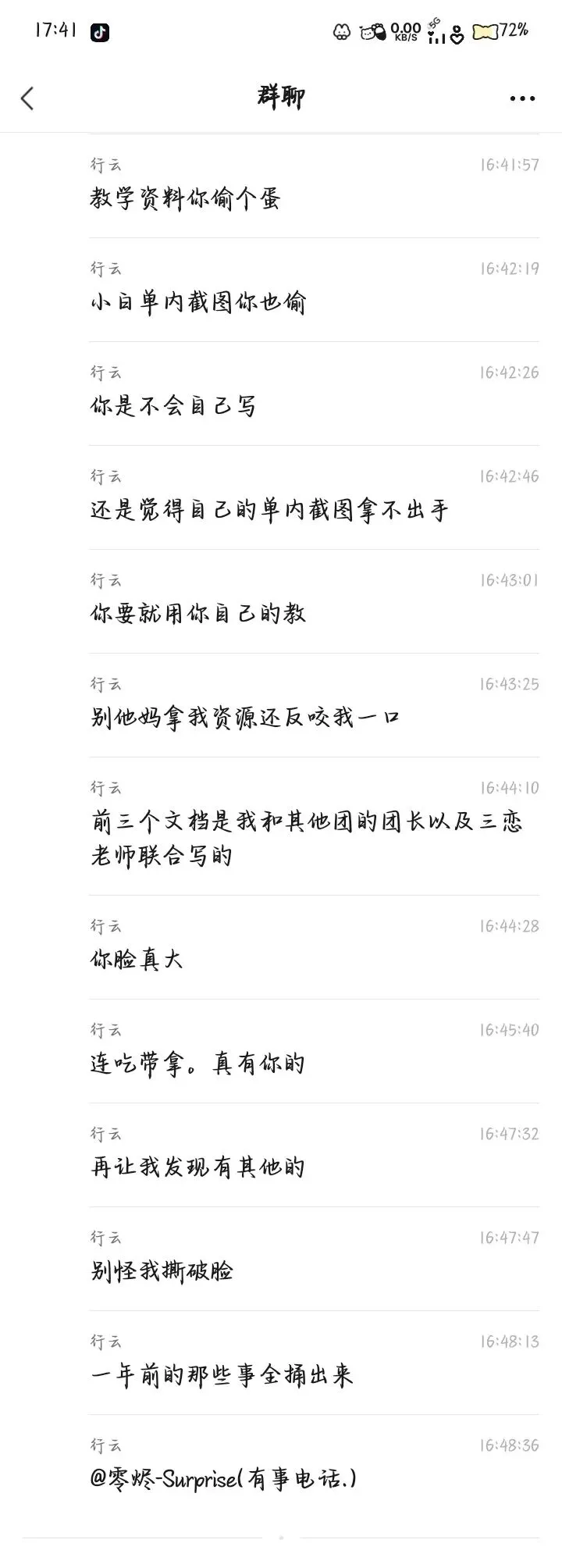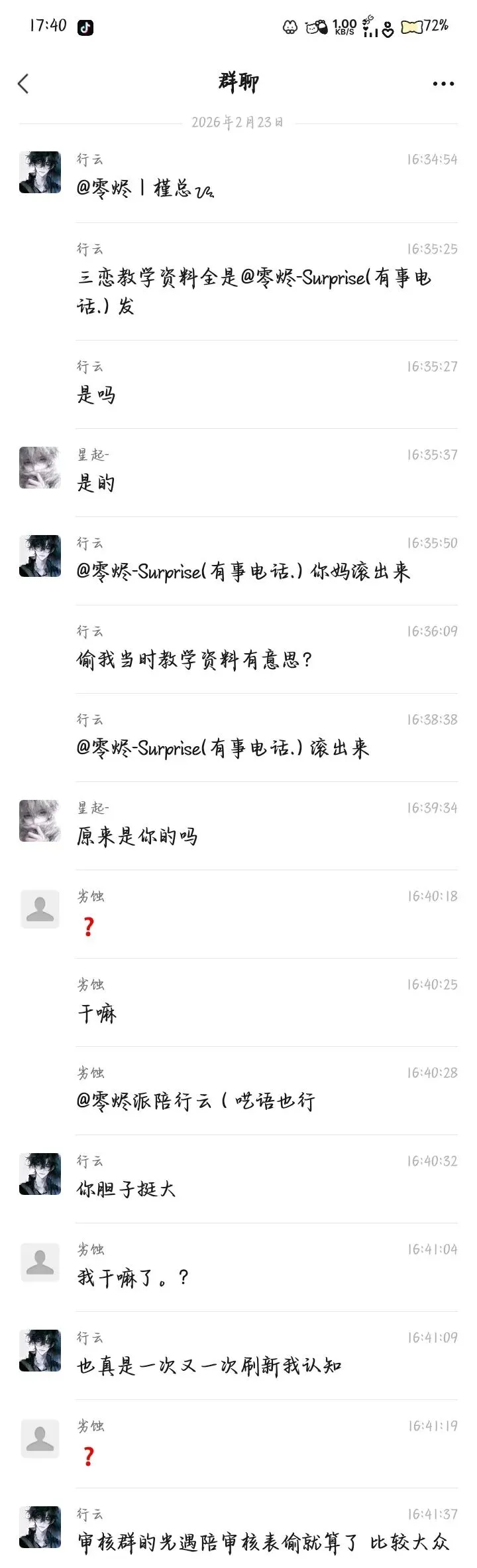 瓜3:偷行云三恋团用培训资料,偷白陵单内截图,二转至四个团。在26年2月中旬,行云在零烬正常和团员唠嗑,讨论三恋,其中一个团员发了三恋教学资料,说是surprise发的,行云再三确认之后,把正在教学surprise叫到闲聊群进行对峙,结果就是行云将surprise骂一顿之后,surprise退团了。