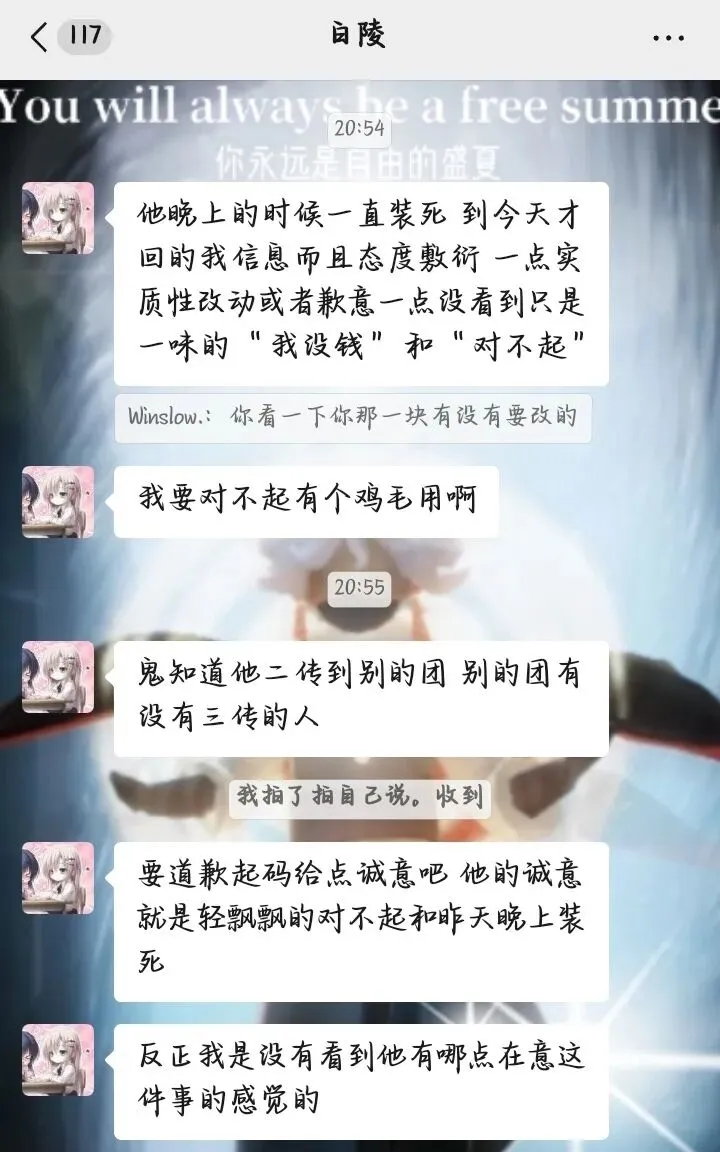 留言:对于这次牵扯到的团(零烬 夏茉 雪色境 旧诗集 暮岚)表示致歉,是瓜主将行云和白陵的资料和单内截图二转,望上述团相关人员看到后进行避雷,对于夏茉进行郑重道歉,瓜主在夏茉是代理团长,行云不由分说带着阿木,白陵直接去闲聊群“闹事”,对团内带来不好影响。以及对于占用公共资源致歉