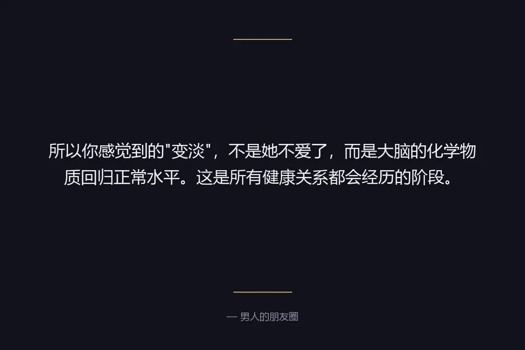 前几天一个兄弟找我倒苦水:"兄弟,我跟她在一起刚好一个月,感觉她没那么热情了,回消息也没以前快,约会也不怎么主动了。是不是不爱了?"