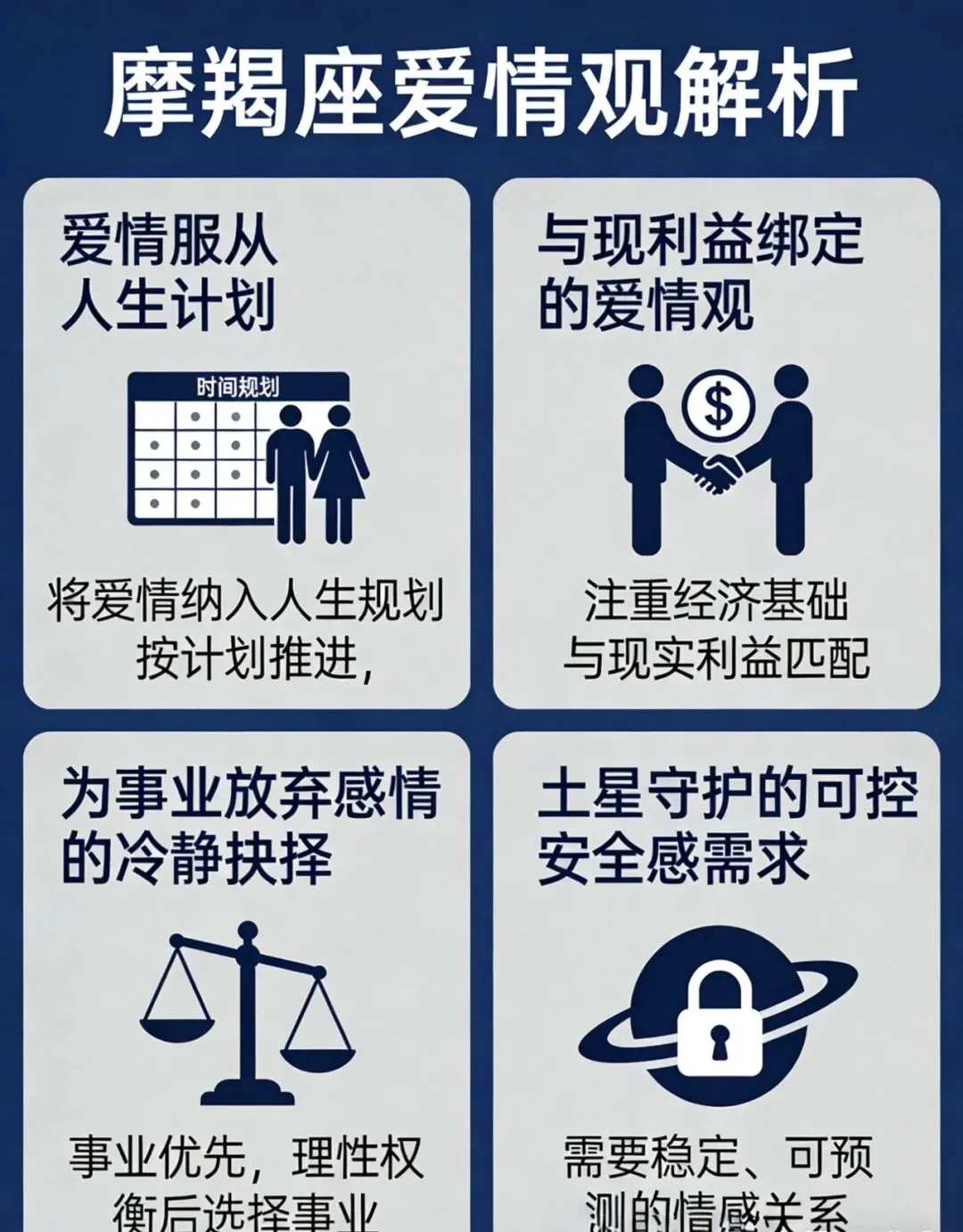 恋爱服从于人生计划,若感情阻碍事业发展,会毫不犹豫放弃。土星守护的摩羯追求可控的安全感,认为爱情需与现实利益绑定。