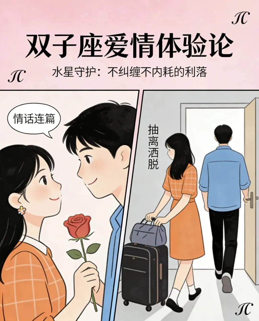 热恋期情话连篇,但新鲜感消退后迅速抽离,不纠缠不内耗。水星守护的双子将爱情视为体验,用好奇心代替执念。