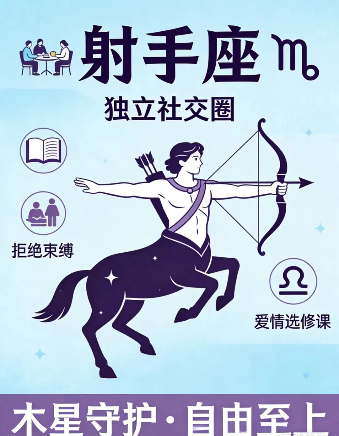 恋爱中保持独立社交圈,拒绝被束缚,木星守护的射手将爱情视为选修课,不愿为情感牺牲自由。