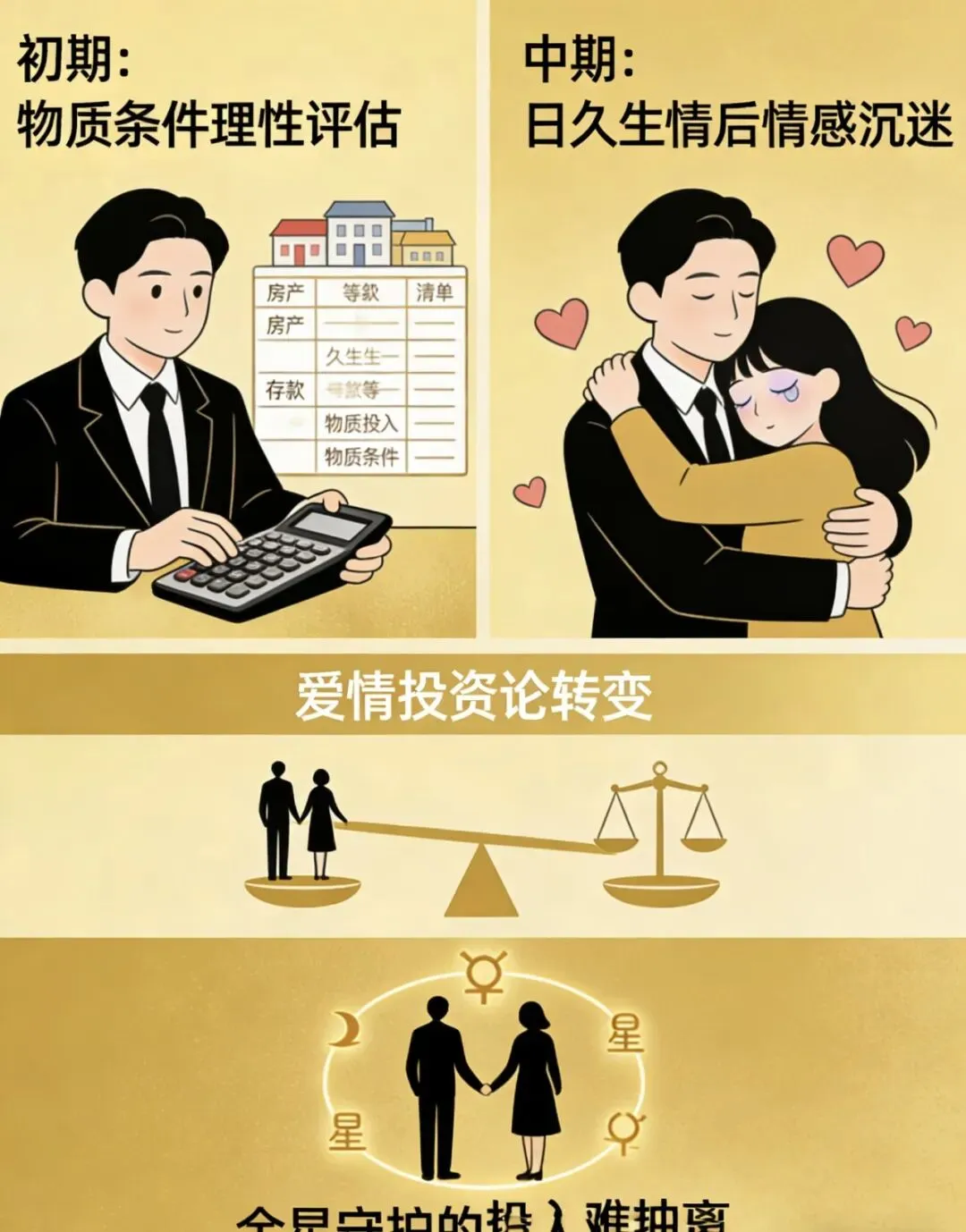 初期理性评估物质条件,日久生情后逐渐失去理智。金星守护的金牛将爱情视为投资,一旦投入便难以抽离。