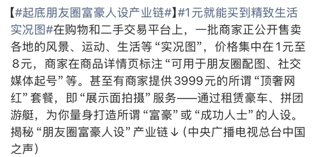 事情起因是:“近日我国媒体曝光了一则网络乱象其内容就是揭秘富豪产业链,根据媒体披露某些平台有专业的商家提供照片打造,从而帮助需求者满足自己的虚荣心。根据照片中的信息我们可以看到仅需1元至10元商家就会提供不同的照片服务,其中包括全球各地的风景、旅游、生活实况图,以及通过租赁豪车、游艇拼团、国外购物、高尔夫等高端项目来帮需求者打造“富豪、精英人设”,当然这个需要的费用则要比前者高出不少”。