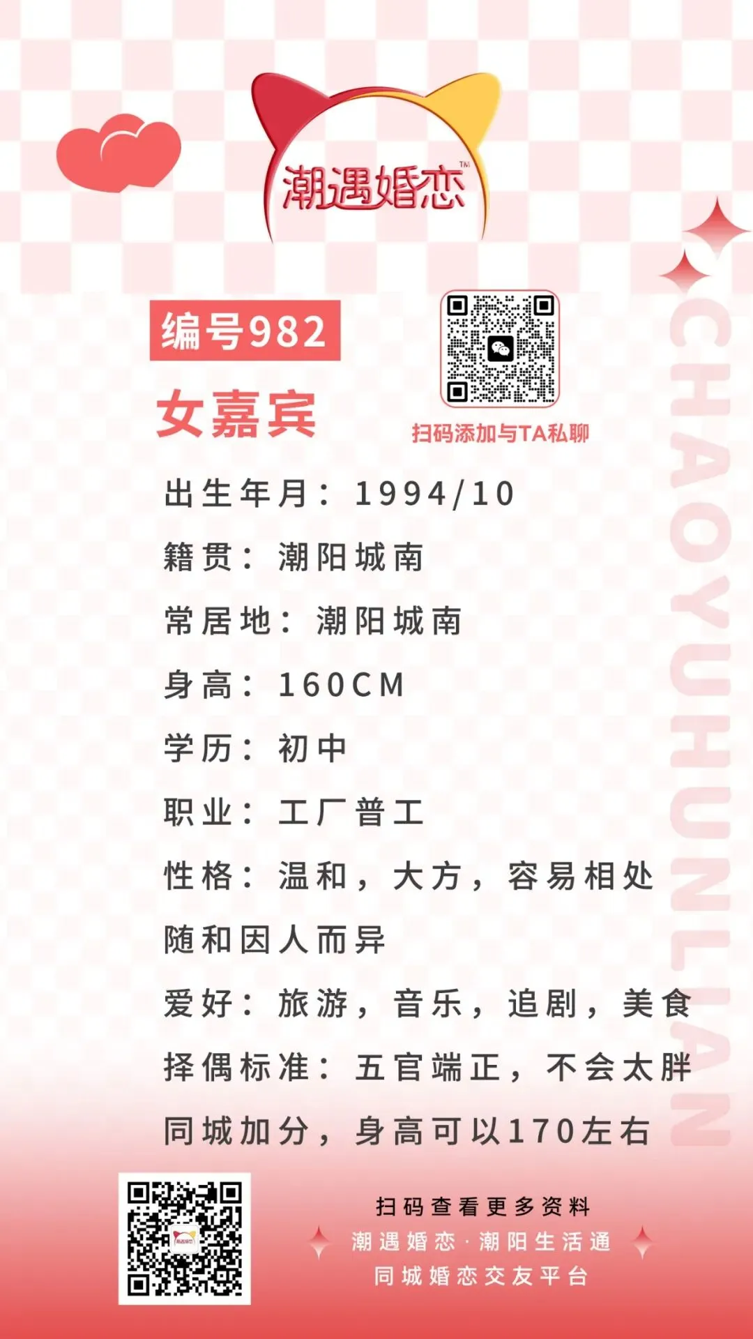 潮遇婚恋|(编号982)棉城女子,94年,择偶标准…