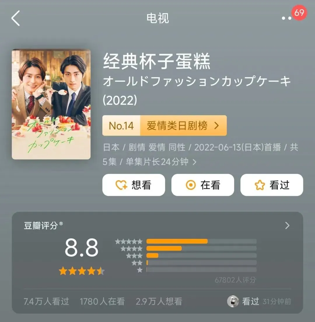 他在2022年主演的《经典杯子蛋糕》有极高的口碑,是那年评分最高的腐剧。(这部准备了ZY,获取见评)