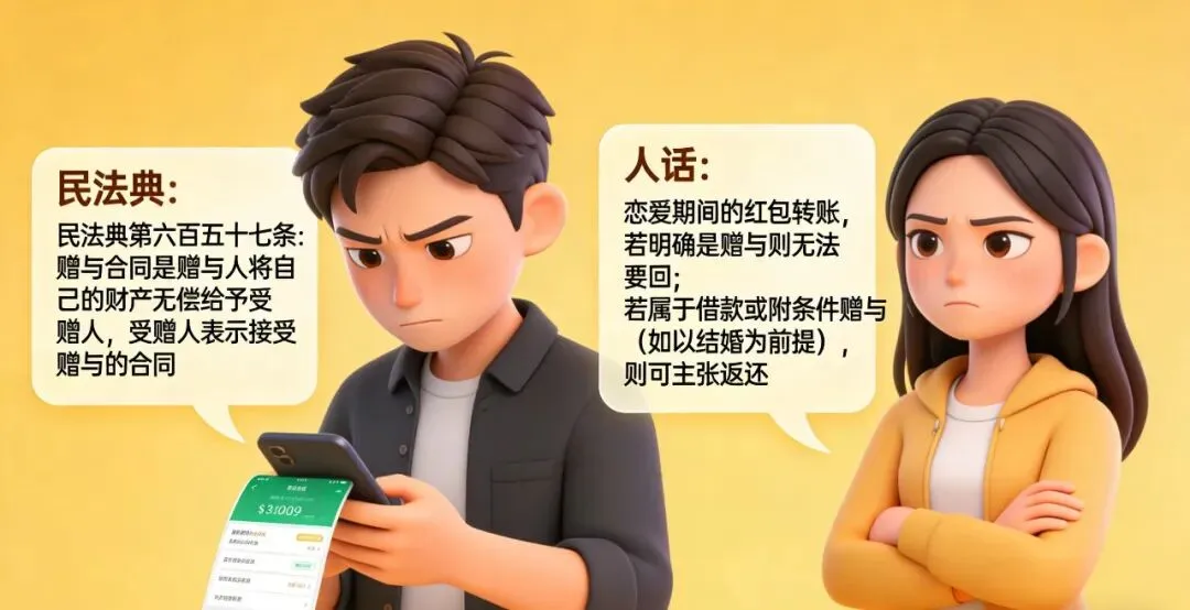 《最高人民法院关于审理涉彩礼纠纷案件适用法律若干问题的规定》:恋爱期间的小额赠与(如520、1314),一般不予返还;但以结婚为目的的大额转账(如购房款),可视为彩礼,分手后可要求返还。