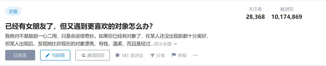 知乎上有一个热议的问题:“已经有女朋友了,但又遇到更喜欢的对象怎么办?”