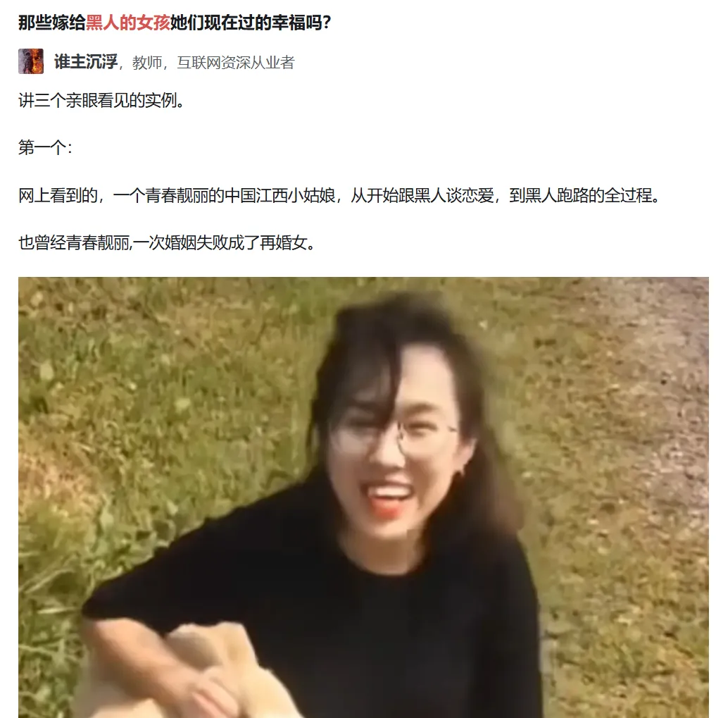 在“嫁给黑人的女孩她们过的幸福吗?”的问题下,有一位网友分享了一位江西女孩与黑人从恋爱结婚生娃到最终黑哥跑路的全过程。
