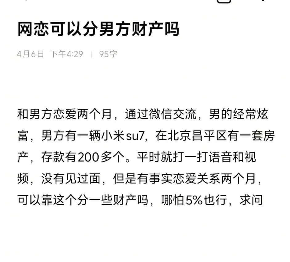那这个是起号的还是真的?如果真的有这个想法,那就太炸裂了。毕竟只是和男方谈恋爱,连夫妻都不算。网恋,打视频语音,这样子就想分财产,而且还哪怕5%都可以。