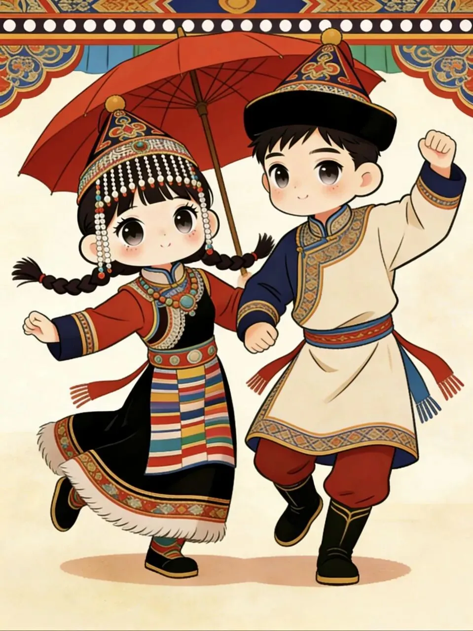 红伞是草原上最灵动的姑娘,梳着七条乌黑发辫,辫梢缠满彩色丝绒线,前额垂着珊瑚珠串成的珠帘,行走时珠玉轻响,如草原溪流叮咚。她擅长刺绣与歌唱,能把草原的日月星辰都织进锦缎,唱进歌谣。安江则是部落里最矫健的骑手,骏马踏过的地方,尘土都带着豪情,他手握马鞭,夺冠时的笑容比祁连山的阳光还耀眼。