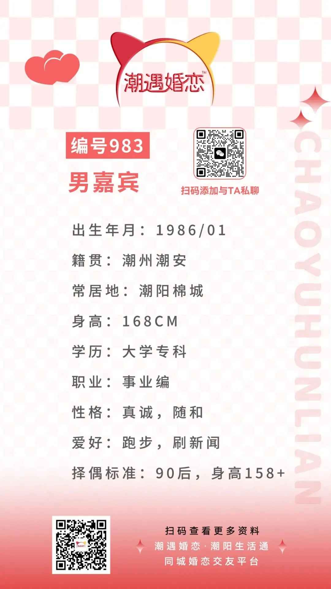 诚意想与嘉宾认识的可扫码联系潮遇红娘牵线,将本期嘉宾的编号/交友卡片发送给潮遇红娘,开启心动模式,与嘉宾微信聊天深入了解哟!