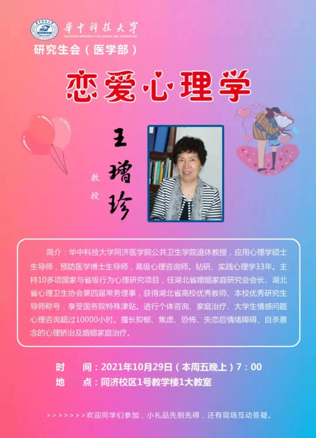 王增珍,华中科技大学同济医学院公共卫生学院退休教授,应用心理学硕士生导师,预防医学博士生导师,高级心理咨询师。1977年毕业于原同济医科大学公共卫生系,留校后在师资培训班学习两年。1983-1986年攻读硕士学位研究生,86年获得硕士学位,1988-89年在美国北卡大学学习行为、心理与卫生管理。钻研、实践心理学33年,主持10多项国家与省级行为心理研究项目,在卫生统计综合评价研究方面主要进行Meta分析、心理量表的开发和评价、亚健康、伤害危险因素评价等,在国际国内杂志上发表相关论文70余篇,多次参编《预防医学》等全国统编教材。华中科技大学学报中文医学版编委、英德文版杂志编委,任湖北省婚姻家庭研究会会长、湖北省心理卫生协会第四届常务理事,获得湖北省高校优秀教师、本校优秀研究生导师称号,享受国务院政府特殊津贴。美国俄亥俄州立大学医学院客座教授。进行个体咨询、家庭治疗、大学生情感问题心理咨询超过10000小时。擅长抑郁、焦虑、恐怖、失恋后情绪障碍、自杀意念的心理矫治及婚姻家庭治疗。