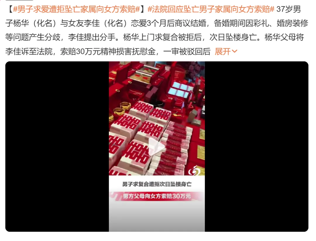 今天,新疆乌鲁木齐的一则判决引发热议:37岁男子杨华(化名)与女友李佳(化名)恋爱3个月后商议结婚,因彩礼、婚房装修等问题产生分歧,李佳提出分手。杨华上门求复合被拒,次日坠楼身亡。