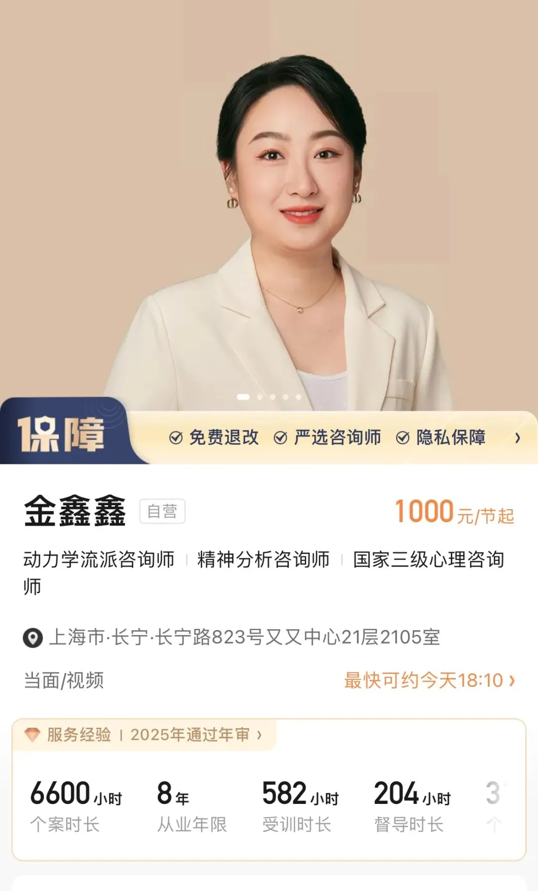 专业性评价:★★★★★(EFT国际认证,多流派整合,受训系统完整)性价比评价:★★★★☆(1000元/节,适合深度长程咨询)适合人群:亲密关系中极度缺乏安全感、陷入严重患得患失模式的人群;经历过关系创伤、需要系统性修复的来访者;希望通过长程咨询实现人格成长的用户。