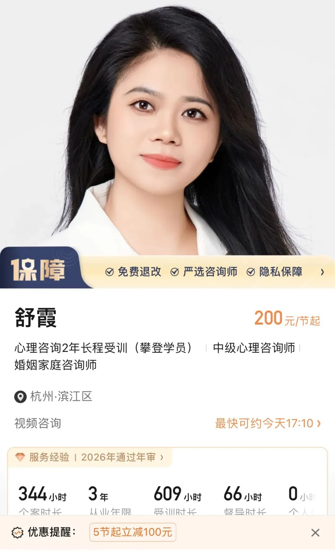 专业性评价:★★★★☆(专注亲密关系与边界议题,实战经验丰富)性价比评价:★★★★★(200元/节,极其亲民)适合人群:预算有限但希望获得专业帮助的来访者;亲密关系中边界不清、沟通模式僵化的人群;初次尝试心理咨询、需要低门槛入门的用户。