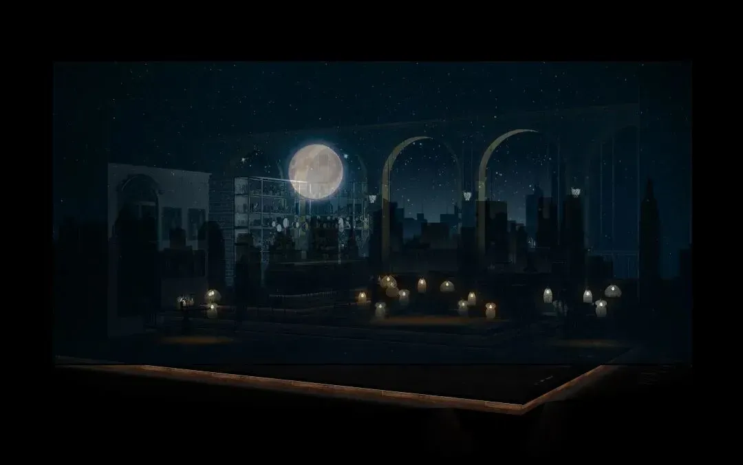 整个场景的设计都诣在增进男女主角情感的温度。舞台做了倾斜的处理,一部分舞台延伸到了乐池,拉近了和观众的距离,两点透视的设计在视觉上使空间有了延伸,空间更加开阔,舞台空间的变化伴随着男女主角的想象进行切换,故事会有更流畅的呈现。
