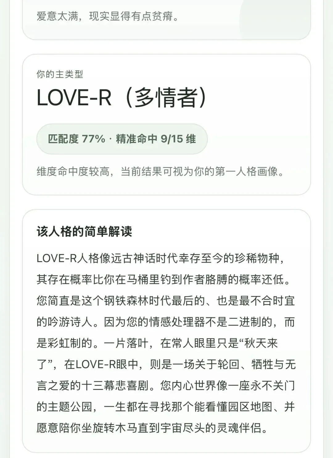 情感世界过于丰盈,太理想化,放在现实里浓缩成三个字,就是恋爱脑。没救的那种🤪🤪🤪内心世界像一座永不关门的主题公园,一生都在寻找那个能看懂园区地图、并愿意陪你坐旋转木马直到宇宙尽头的灵魂伴侣。还在幻想童话故事。即便理性知道不切实际,但依旧改变不了天生的本质。依恋安全感