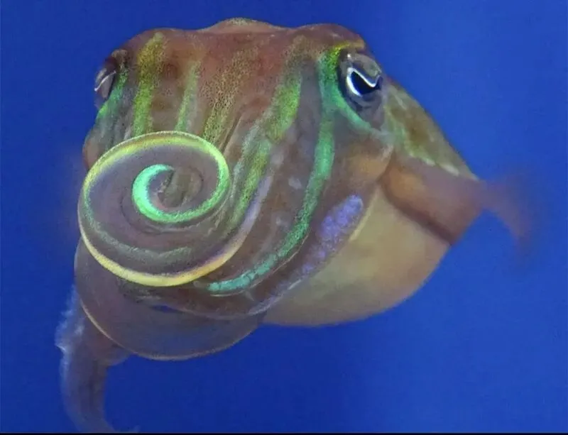 雄性孔雀会展开华丽的尾羽求偶,而乌贼、章鱼等头足类动物虽无法分辨色彩差异,却能识别一种有别于色彩和亮度的光学特性——偏振光。偏振光是光波的振动方向呈现定向偏斜的光线。研究证实,雄性会伸出长腕足,让经表皮特殊细胞反射的光线穿透透明的肌肉,巧妙地形成鲜艳的偏振光图案,以此开展求偶行为。动物的交流世界实在有趣。