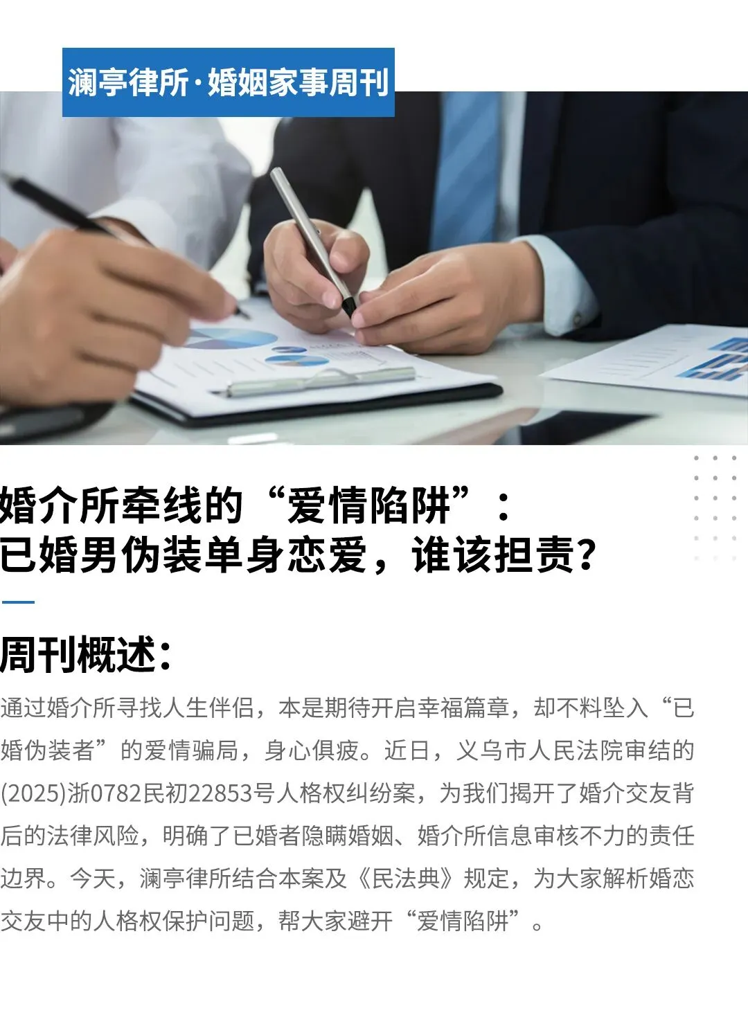 个人婚恋交友时,一定要守住底线避免“被小三”,见面时要求对方出示身份证、户口本等有效证件,必要时通过合法途径核实婚姻状况,对相识不久就急于确定关系、发生亲密行为的对象保持警惕,要知道婚姻以感情为基础,而非金钱或性交易,同时婚恋期间大额转账、购买贵重物品,务必备注用途,避免被认定为无偿赠与,同时留存聊天记录等证据。选择婚介服务时,要明确自身权利防范信息失真,优先选择有合法资质的婚介机构,查看营业执照及相关许可文件,签订服务合同时,明确婚介所对会员身份、婚姻状况的核实义务及违约责任,不能完全依赖婚介所提供的会员信息,需通过多种途径自行核实,降低被骗风险。若不幸遭遇婚恋欺骗,要依法按流程维权,立即保存聊天记录、转账凭证、通话录音、就医记录等,证明对方欺骗行为及自身损害程度,果断终止恋爱关系,避免损失扩大,必要时寻求心理咨询,在确保安全的前提下,与对方协商赔礼道歉及赔偿事宜,可委托律师介入,协商无果时,向法院提起人格权纠纷诉讼,要求赔礼道歉并赔偿精神损害抚慰金。对于婚介机构而言,要强化合规管理规避法律风险,建立双重审核机制,要求会员提供身份证、户口本、婚姻证明等有效证件,并通过官方渠道核实,在服务合同及宣传材料中,醒目提示“会员信息自行填写,需谨慎核实”,尽到风险提示义务,完善投诉处理流程,接到会员投诉后,及时核实情况,协助维权,避免引发连锁纠纷。婚姻的基础是诚实与信任,婚恋交友中任何形式的欺骗都是对人格尊严的侵害,更是对法律与道德的漠视。本案的判决结果既明确了已婚者隐瞒婚姻骗恋爱的侵权责任,也界定了婚介所的法律边界,为婚恋市场的规范发展提供了司法指引。希望每一位在婚恋路上的朋友,都能保持理性与警惕,既相信爱情的美好,也懂得用法律武器守护自身权益。若你正遭遇婚恋纠纷,需要梳理证据、代写诉状或代理诉讼,可随时联系澜亭律所,我们将为你提供专业的婚姻家事法律服务。