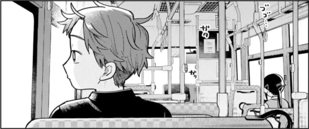 宫台真司认为旧时的浪漫源于关系间的灰色地带(参见宫台真司《〈海潮之声〉的浪漫主义》),换言之,秘密即浪漫。恋爱喜剧的创作一度延续了这一传统,迟钝系男主角的发生即与之相关,而此种勉强的性格注定它仅能起过渡的功能,“自然系”男主角未几兴起(参见知乎@熊腾浩《恋爱喜剧的进化——由迟钝型后宫流到多样化套路》),这是一种主动的性格,其背景是男女之间的秘密越来越不成为秘密,浪漫的发生方式也随之变化。就此而言,《二人巴士》是一部折中的自然系漫画。其并未舍弃“秘密即浪漫”的塑造法,而经由乡村中学生——这一受双重束缚的视野将秘密再次拉回读者的情感世界。对于生于花谷、长于花谷的春平,在外求学的小杏正意味着秘密。那是他未曾经历、又渴望经历的外部世界,也是他之于异性的朦胧幻想。当小杏调戏般地将脚触碰到他的脚时,这种令人怦然心动的“触及秘密的感觉”是极令读者享受的。