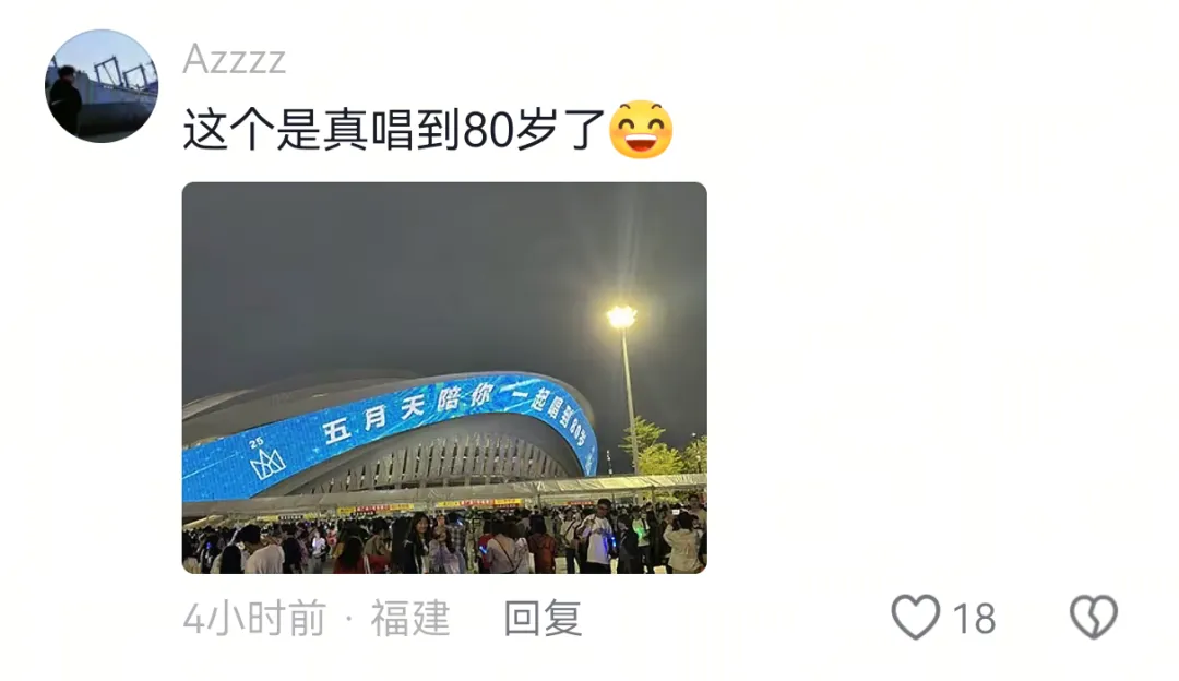 五迷老师含量严重超标。不过仔细想想还真是——五月天唱了二十多年,当年听《恋爱ING》的那群人,现在正好四五十岁。叔叔阿姨们奏的不是曲子,是和自己青春的双向奔赴。