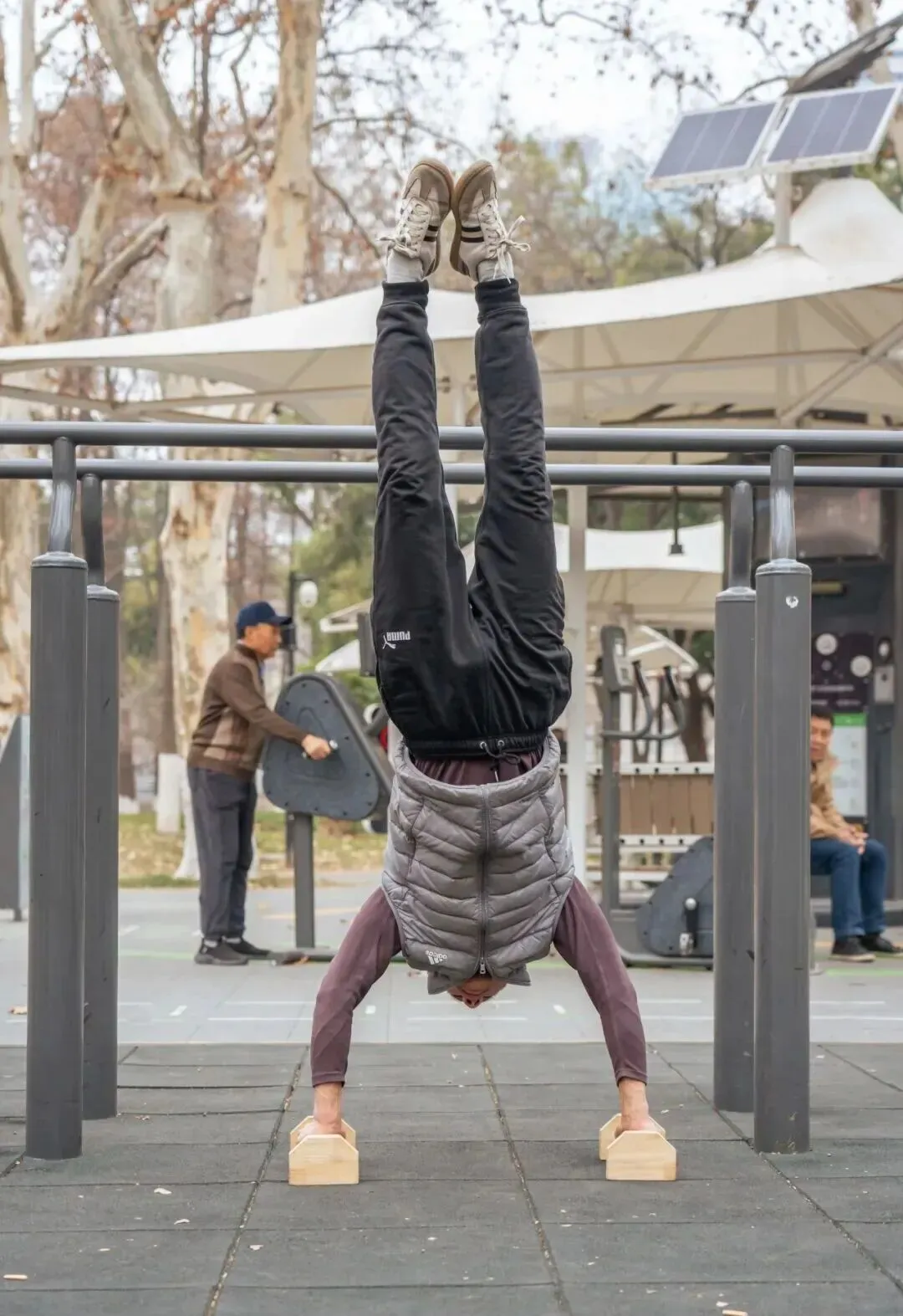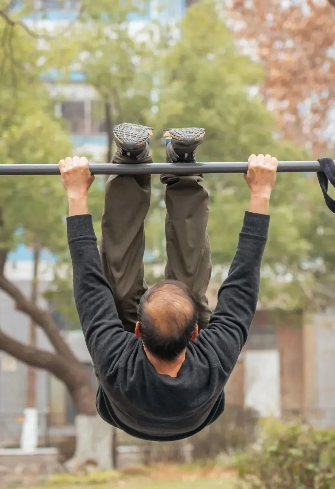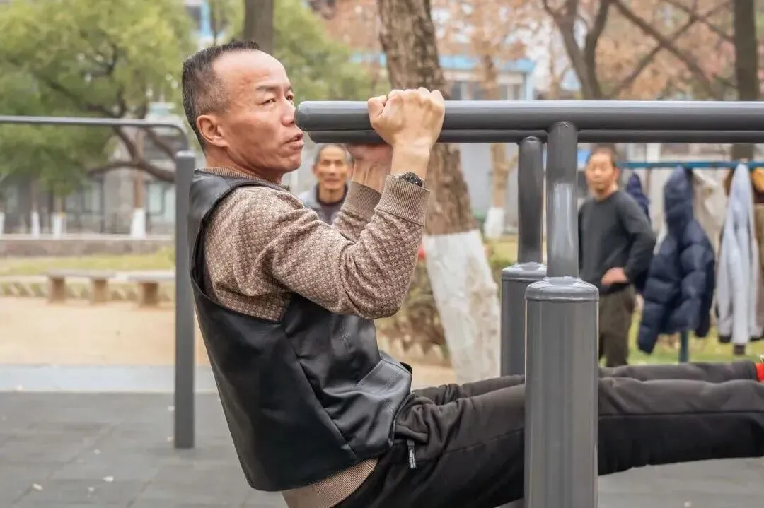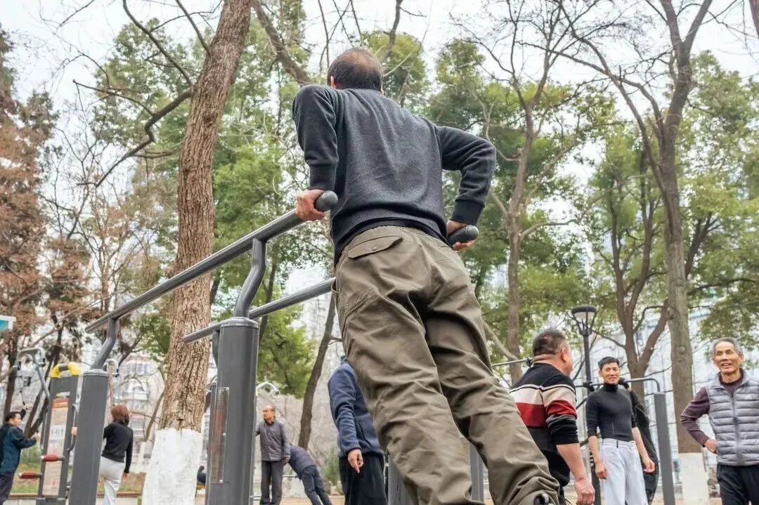 公园双杠区里,爹爹们上杠、腾挪、倒挂金钩,卧鱼、双盘、凌空跟头——各种高难度绝活行云流水,挺拔利落得像体操队训练。玩够了,拍拍手,气定神闲。硬核程度让“脆皮年轻人”自愧不如。