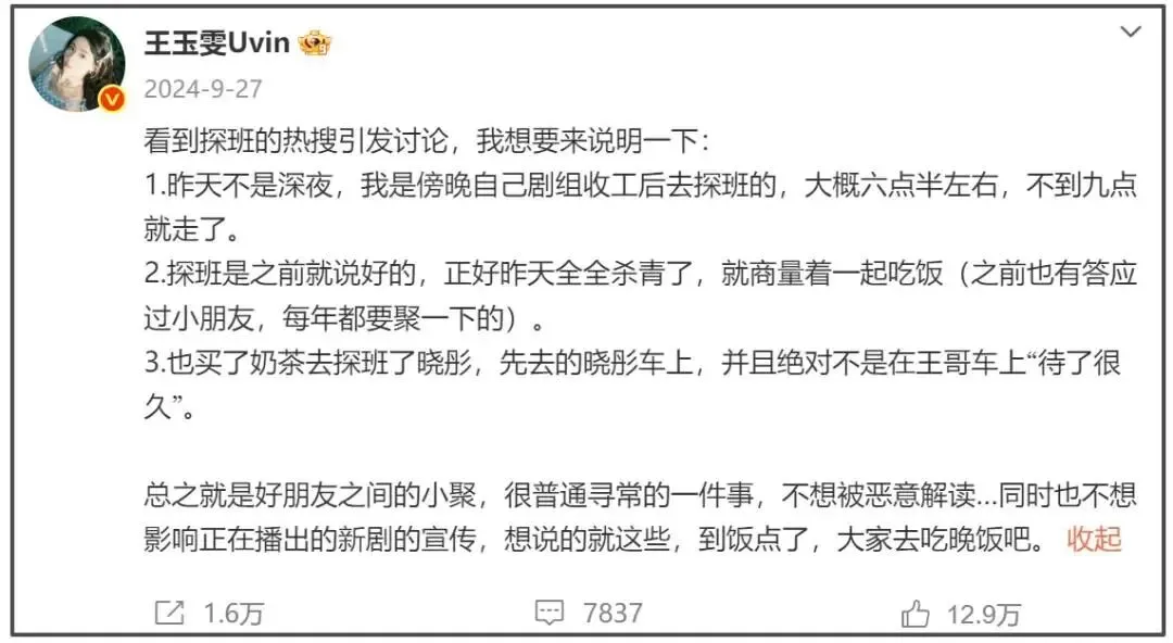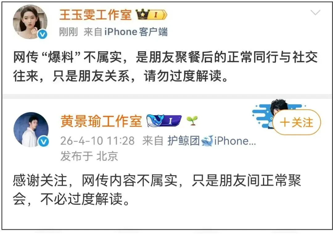 消息曝光后,王玉雯和黄景瑜工作室火速澄清,通通称网传“爆料”不属实,只是朋友间的正常聚会,不必过度解读。对比两人工作室声明,也能发现话术基本一致,只是王玉雯更清楚地说明了两人是朋友关系。