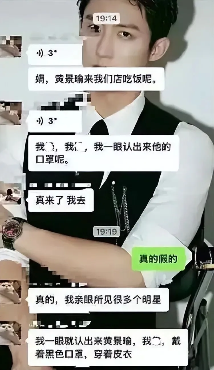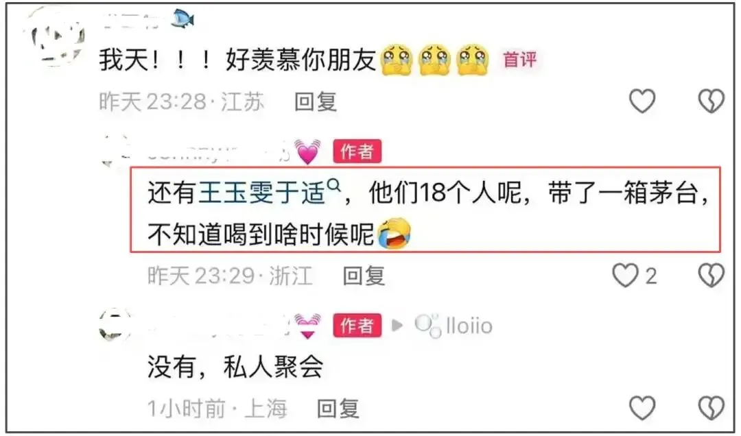 爆料人还称现场有王玉雯、于适、黄景瑜等,他们带了一箱子茅台,并晒出了和于适、黄景瑜的合照。网传于适和王玉雯有广告要拍,跟黄景瑜没啥关系,不知道这私人聚会他去干嘛,最后还和王玉雯一起回酒店。