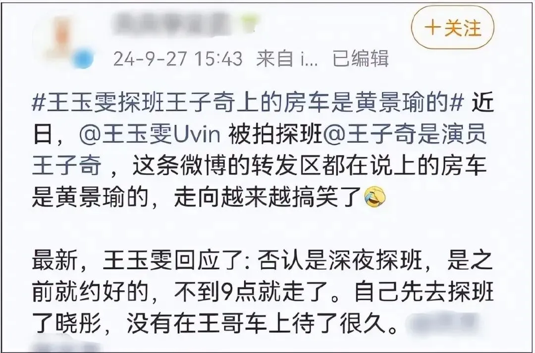 而黄景瑜和王玉雯为啥会传恋情,也是因为看起来没交集,但总能在一个摊子上出现。两年前俩人就被曝了一桩趣事儿。当时,有消息曝王玉雯去探班王子奇上了黄景瑜的房车,那会儿王玉雯和王子奇还有恋情传闻,王玉雯发文澄清否认深夜探班,称只是按照约定探小朋友的班,下午6点去晚上9点离开,绝对没有在王哥房车上“待了很久”,间接辟谣了黄景瑜的房车和恋情。