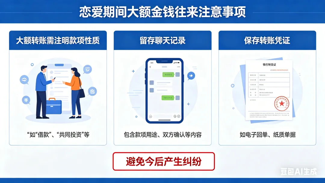 恋爱期间大额赠与(如购房、购车款),若隐含缔结婚姻期待,视为附条件赠与,分手可要求返还;共同消费支出无需返还;“我养你”等甜蜜表述不能单独作为赠与依据。恋爱期间大额转账需明确款项性质,备注清晰并留存聊天记录、转账凭证等证据,避免后续纠纷。