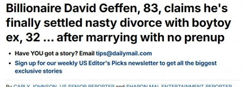亿万富翁婚姻危机,爱与财富,未签协议的代价他大卫·格芬,83岁了,是影视大亨,身家几百亿,大家都在说他,很有钱,他创立了梦工厂,很有名,他在2023年,结婚了,新郎是他前任,大卫·阿姆斯特朗,那时32岁,他们很低调,结了婚,可是,他没有签,婚前协议,所有人就想,这会怎么样呢,这个决定,就像种子,埋下了隐患,以后会有问题,为了钱,祖孙恋啊,年龄差很大,51岁的差异,这成本,肯定很高。