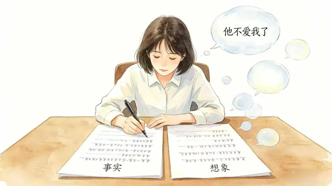 拿出一张纸来,左边写“事实”(比如“他今天没回我信息”),右边写“想象”(比如“他是不是不爱我了?”),