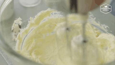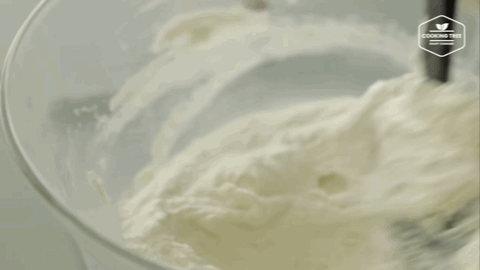 接着倒入淡奶油打发一会,如果发现结块用刮刀翻拌一会,再用打蛋器打发。