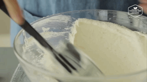 接下来将过筛好的杏仁糖粉分2次倒入与蛋白霜切拌/翻拌均匀,每次都要混合后再加入下一次。