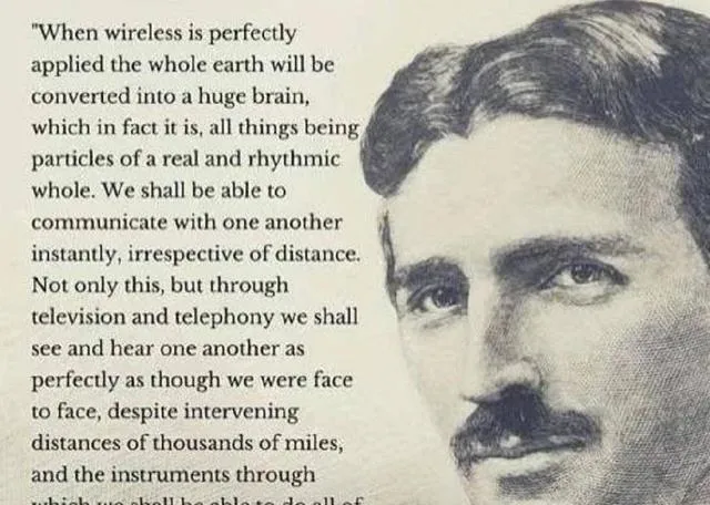 照片上印着一行英文,有种预言家的味道,说起无线通讯全世界变成巨大大脑,几十年前琢磨这事,人家真敢想,现在手机、网络全都有,说到底还是早看穿了未来。